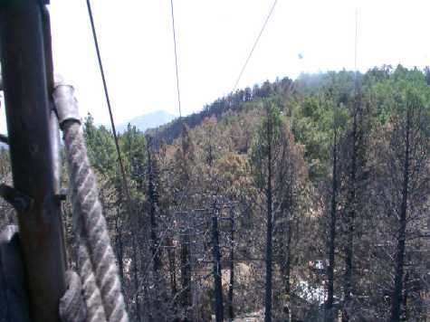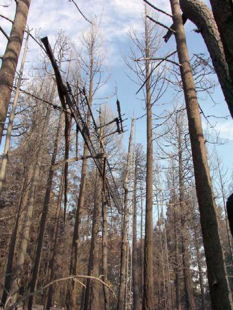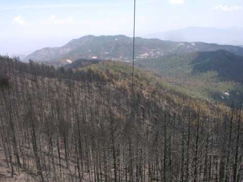 ![]() Fire stopped just West of our site. Note scorched trees marking it's end. |